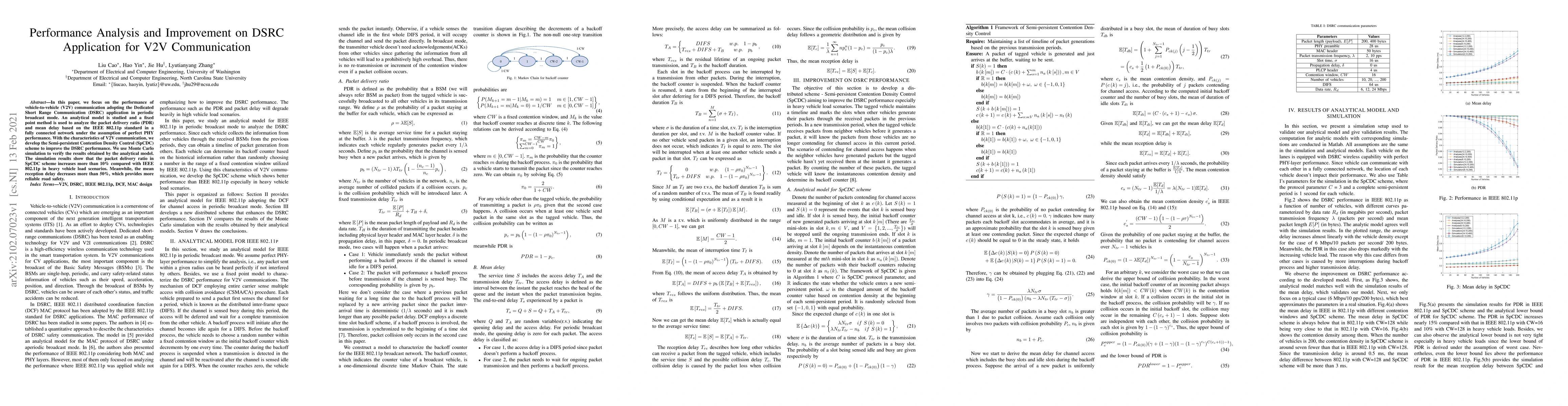 This paper analyzes the performance of DSRC-based V2V communication, developing the SpCDC scheme to enhance packet delivery ratio and reduce mean delay. Simulation results show SpCDC improves PDR by over 10% and reduces delay by more than 50% under heavy load conditions.