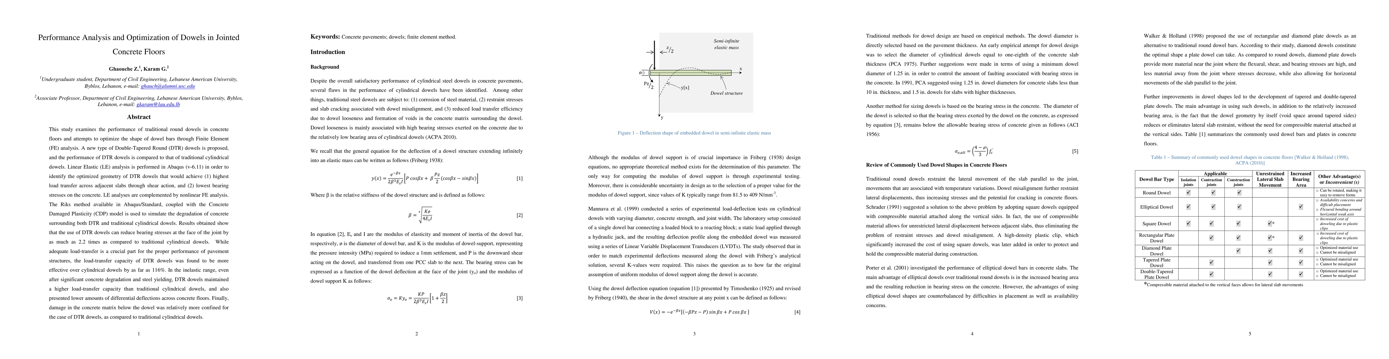 This study optimizes dowel design in jointed concrete floors using Finite Element analysis, proposing Double-Tapered Round (DTR) dowels that outperform traditional cylindrical dowels in load transfer and reduce bearing stresses by up to 2.2 times, with enhanced performance even under concrete degradation.