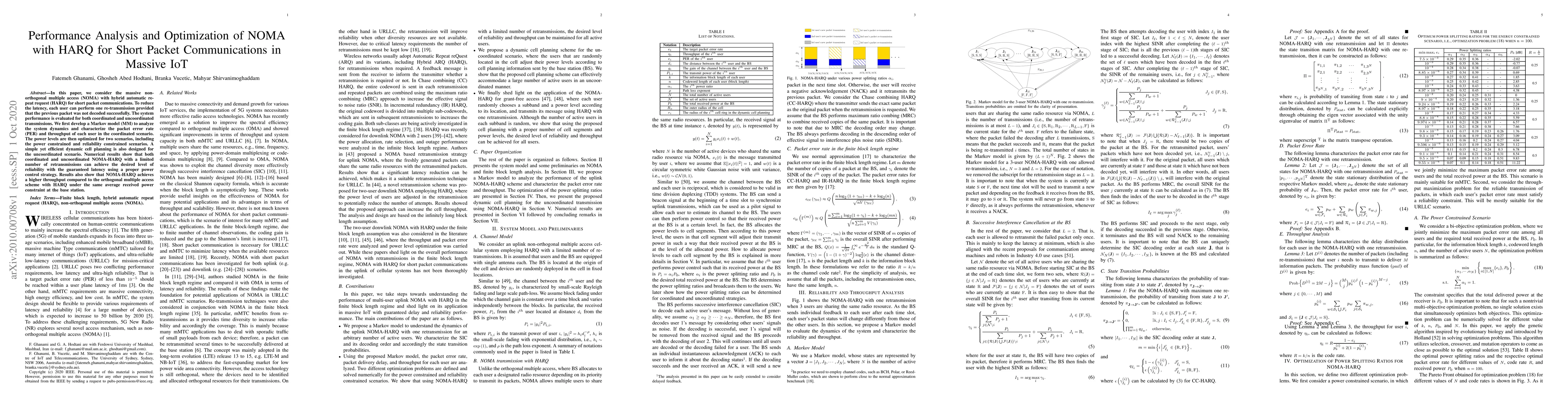 This paper analyzes and optimizes massive non-orthogonal multiple access (NOMA) with hybrid automatic repeat request (HARQ) for short packet communications in IoT. It develops a Markov model to evaluate system performance and optimizes power levels for both coordinated and uncoordinated scenarios, demonstrating higher throughput compared to orthogonal multiple access.