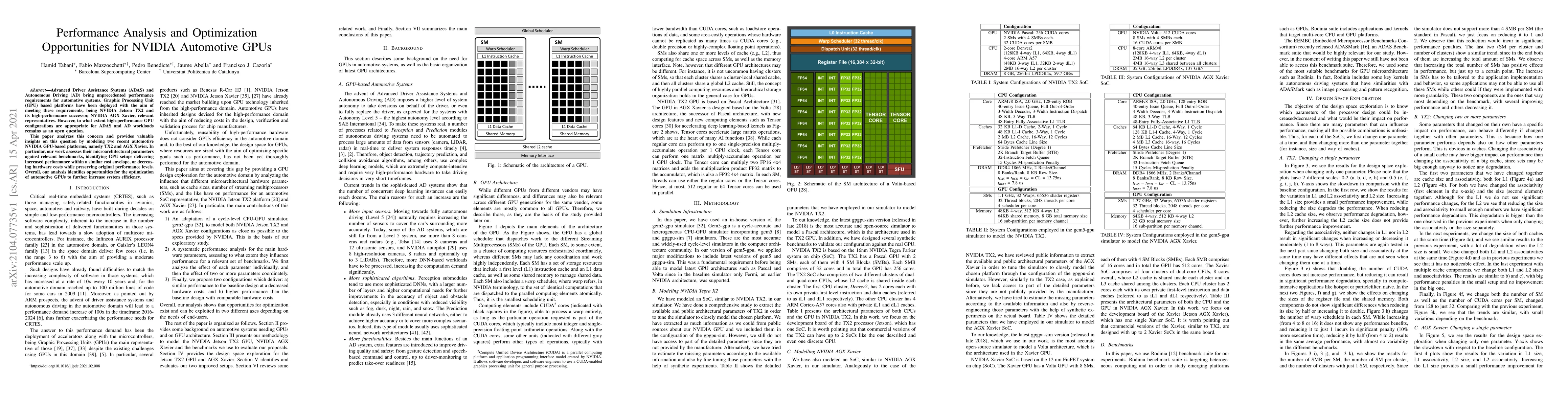Advanced Driver Assistance Systems (ADAS) and Autonomous Driving (AD) bring unprecedented performance requirements for automotive systems. Graphic Processing Unit (GPU) based platforms have been deployed with the aim of meeting these requirements, being NVIDIA Jetson TX2 and its high-performance successor, NVIDIA AGX Xavier, relevant representatives. However, to what extent high-performance GPU configurations are appropriate for ADAS and AD workloads remains as an open question. This paper analyzes this concern and provides valuable insights on this question by modeling two recent automotive NVIDIA GPU-based platforms, namely TX2 and AGX Xavier. In particular, our work assesses their microarchitectural parameters against relevant benchmarks, identifying GPU setups delivering increased performance within a similar cost envelope, or decreasing hardware costs while preserving original performance levels. Overall, our analysis identifies opportunities for the optimization of automotive GPUs to further increase system efficiency.