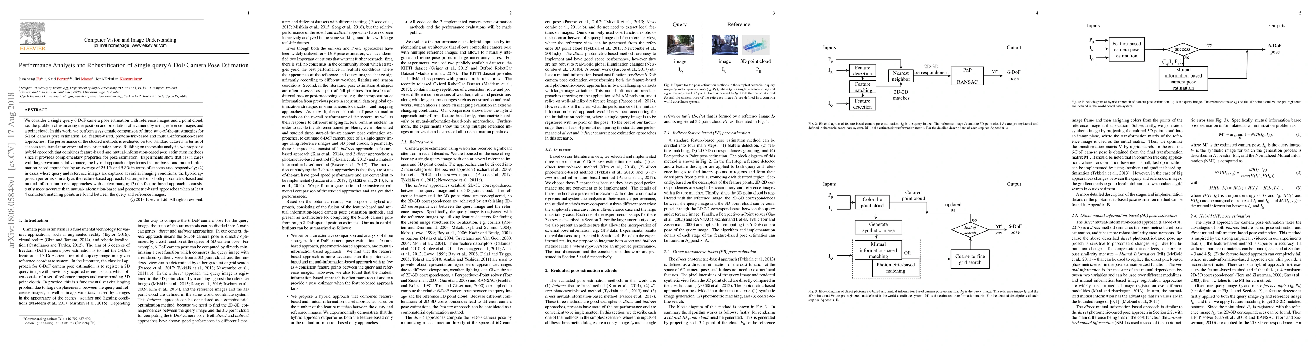 This paper compares three state-of-the-art 6-DoF camera pose estimation methods and proposes a hybrid approach that combines feature-based and mutual-information-based techniques. The hybrid method significantly outperforms individual methods in environments with high variance and performs comparably under similar imaging conditions.