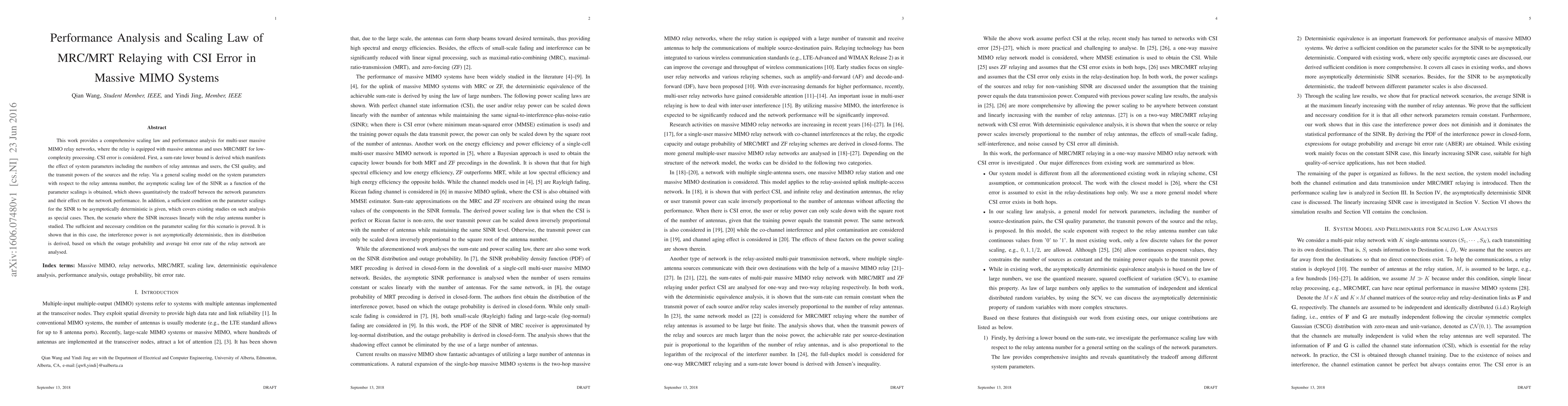 The paper provides a comprehensive scaling law and performance analysis for multi-user massive MIMO relay networks using MRC/MRT for low-complexity processing, considering CSI error.