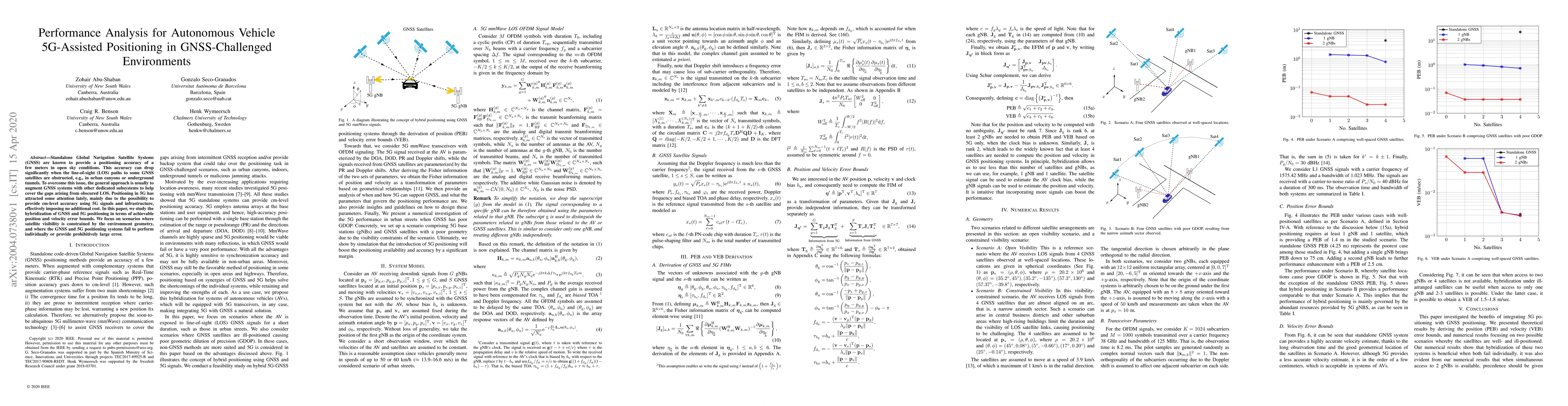 This paper investigates the integration of 5G-assisted positioning to enhance the accuracy of autonomous vehicles in environments where GNSS signals are obstructed, analyzing the achievable position and velocity error bounds under such conditions. The study highlights the potential of hybrid GNSS and 5G systems to provide centimeter-level accuracy without additional costs.