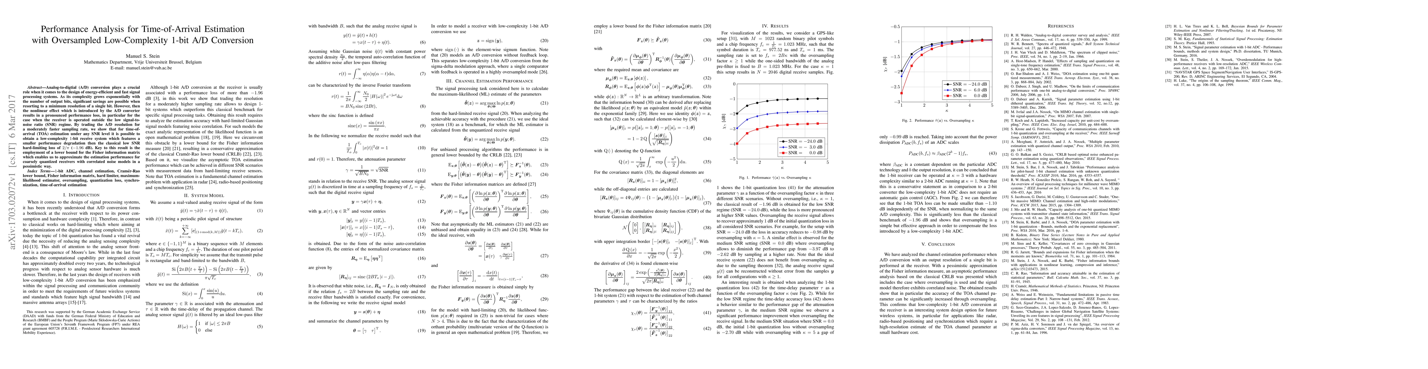This paper investigates the performance of time-of-arrival estimation using oversampled low-complexity 1-bit A/D conversion, demonstrating that it can achieve better performance than traditional low SNR hard-limiting methods by employing a lower bound for the Fisher information matrix. The approach mitigates performance degradation typically associated with low-resolution quantization.