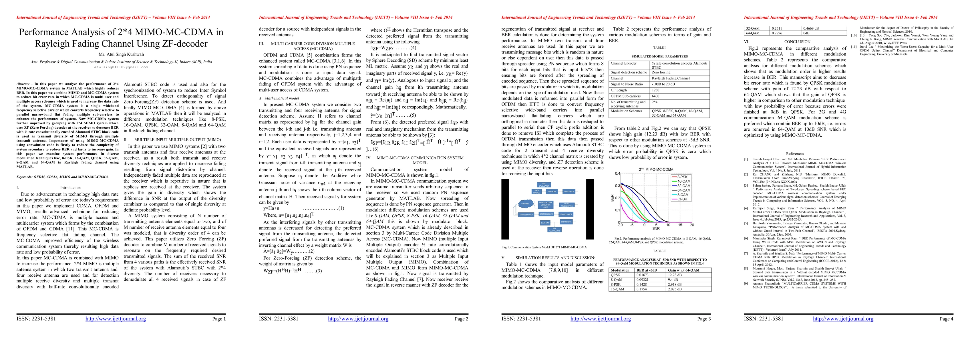 This paper evaluates the performance of a 2x4 MIMO-MC-CDMA system in MATLAB, employing a ZF-decoder to significantly reduce bit error rate (BER). The integration of MIMO and MC-CDMA aims to enhance data rates and system performance through diverse modulation techniques in a Rayleigh fading channel.