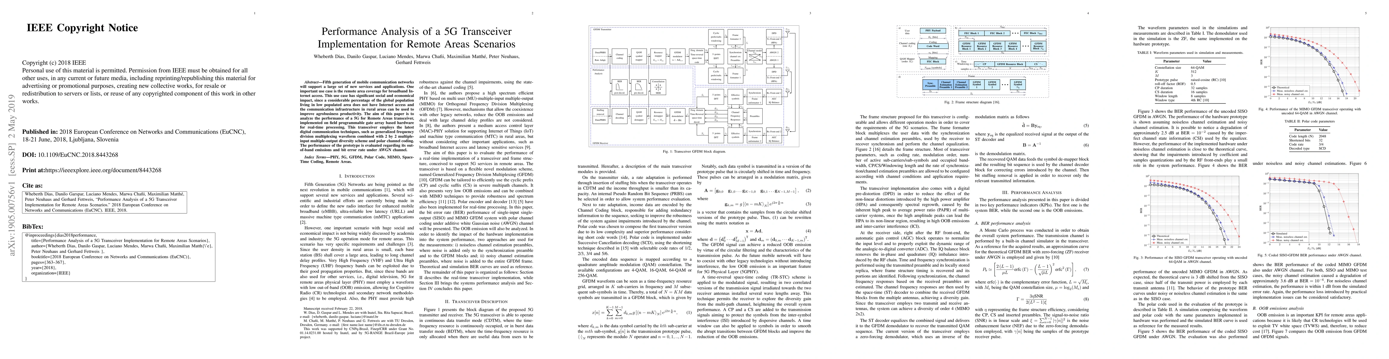 The fifth generation of mobile communication networks will support a large set of new services and applications. One important use case is the remote area coverage for broadband Internet access. This use case ha significant social and economic impact, since a considerable percentage of the global population living in low populated area does not have Internet access and the communication infrastructure in rural areas can be used to improve agribusiness productivity. The aim of this paper is to analyze the performance of a 5G for Remote Areas transceiver, implemented on field programmable gate array based hardware for real-time processing. This transceiver employs the latest digital communication techniques, such as generalized frequency division multiplexing waveform combined with 2 by 2 multiple-input multiple-output diversity scheme and polar channel coding. The performance of the prototype is evaluated regarding its out-of-band emissions and bit error rate under AWGN channel.