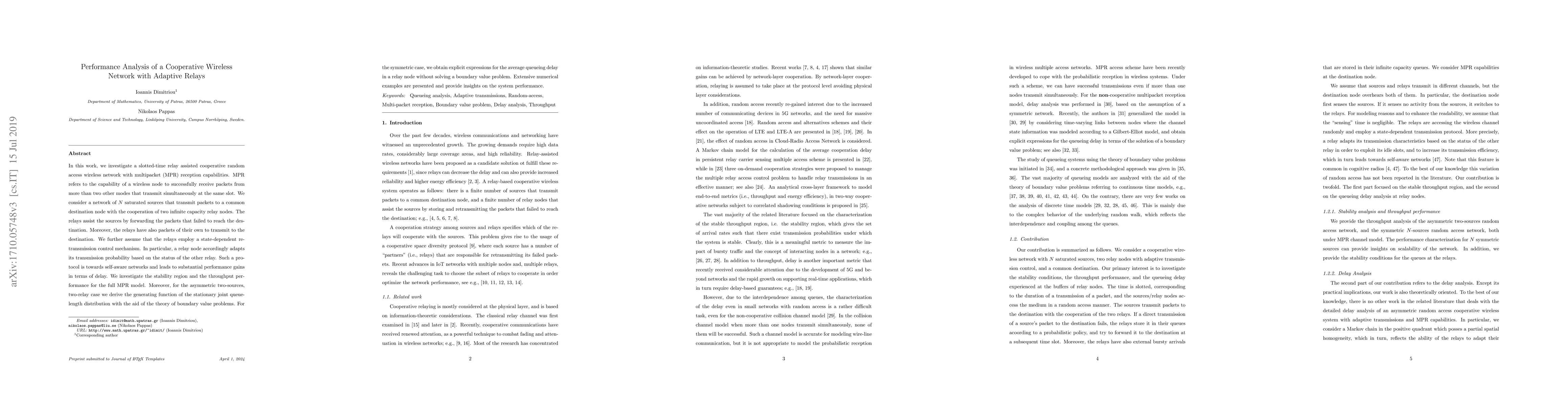 This paper analyzes a cooperative wireless network with adaptive relays that utilize multipacket reception to enhance performance. The study focuses on the stability region, throughput, and delay, deriving analytical expressions for queueing delays and employing numerical examples to validate the model.