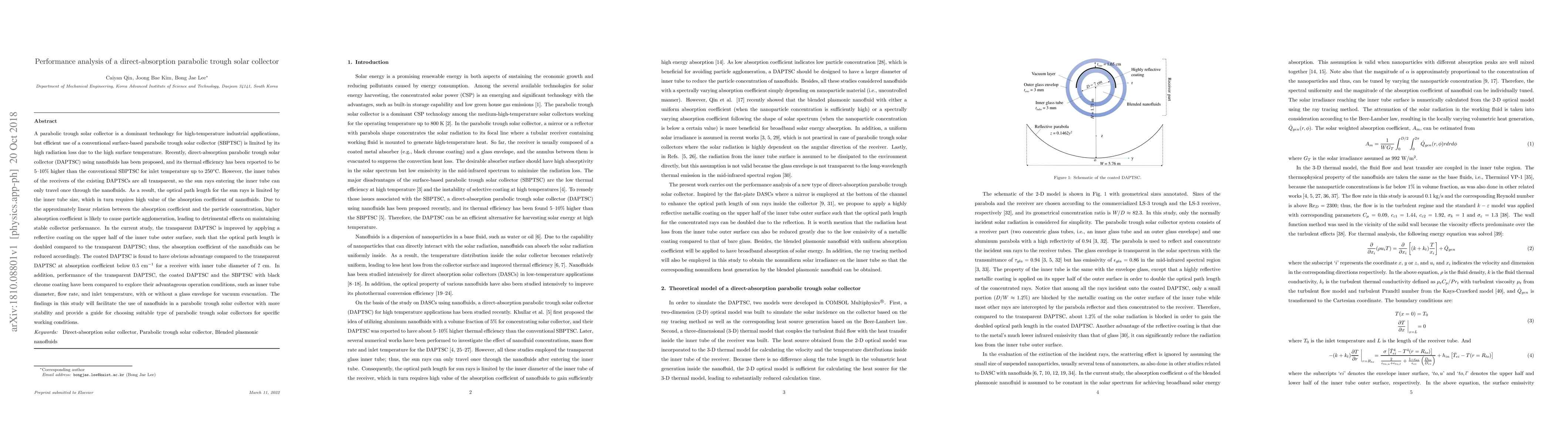 This study analyzes the performance of a direct-absorption parabolic trough solar collector (DAPTSC) with a reflective coating on the upper half of the inner tube to double the optical path length, reducing the required absorption coefficient of nanofluids and preventing particle agglomeration. The coated DAPTSC shows significant advantages over transparent DAPTSC and conventional SBPTSC under various operational conditions.