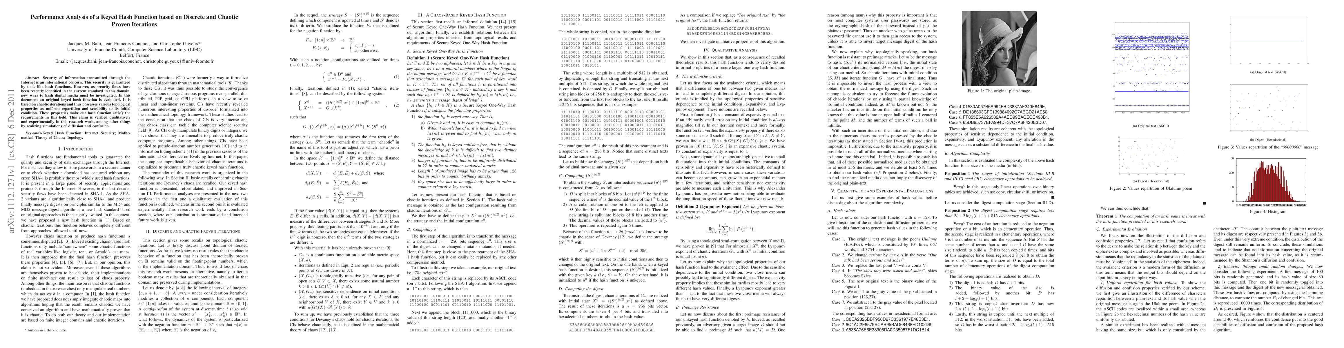 Security of information transmitted through the Internet is an international concern. This security is guaranteed by tools like hash functions. However, as security flaws have been recently identified in the current standard in this domain, new ways to hash digital media must be investigated. In this document an original keyed hash function is evaluated. It is based on chaotic iterations and thus possesses various topological properties as uniform repartition and sensibility to its initial condition. These properties make our hash function satisfy the requirements in this field. This claim is verified qualitatively and experimentally in this research work, among other things by realizing simulations of diffusion and confusion.