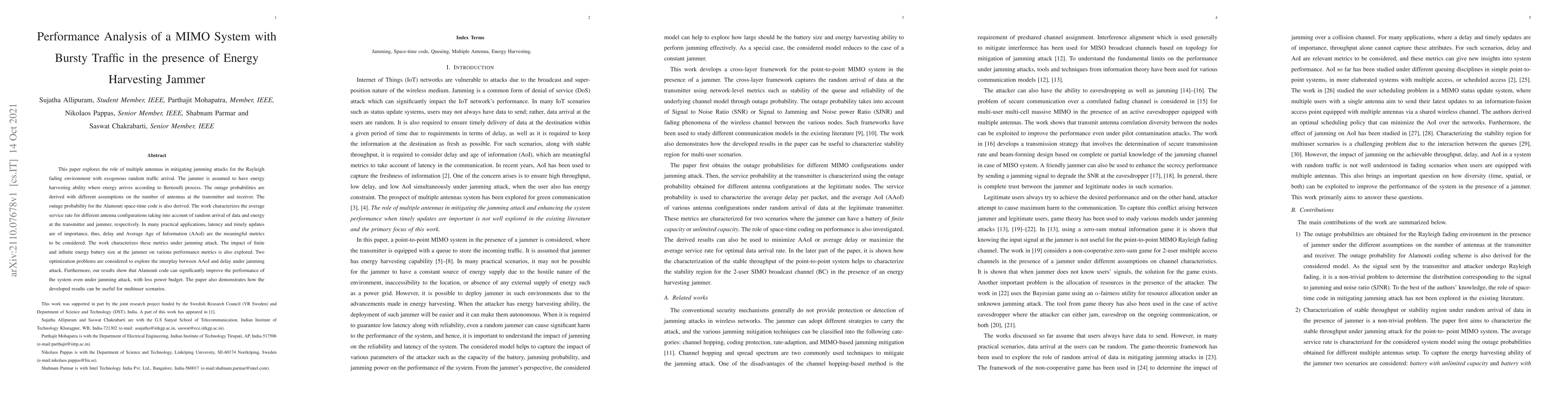 This paper analyzes a MIMO system's performance under jamming attacks with energy harvesting jammers, showing that Alamouti code can improve system performance even with reduced power budgets.