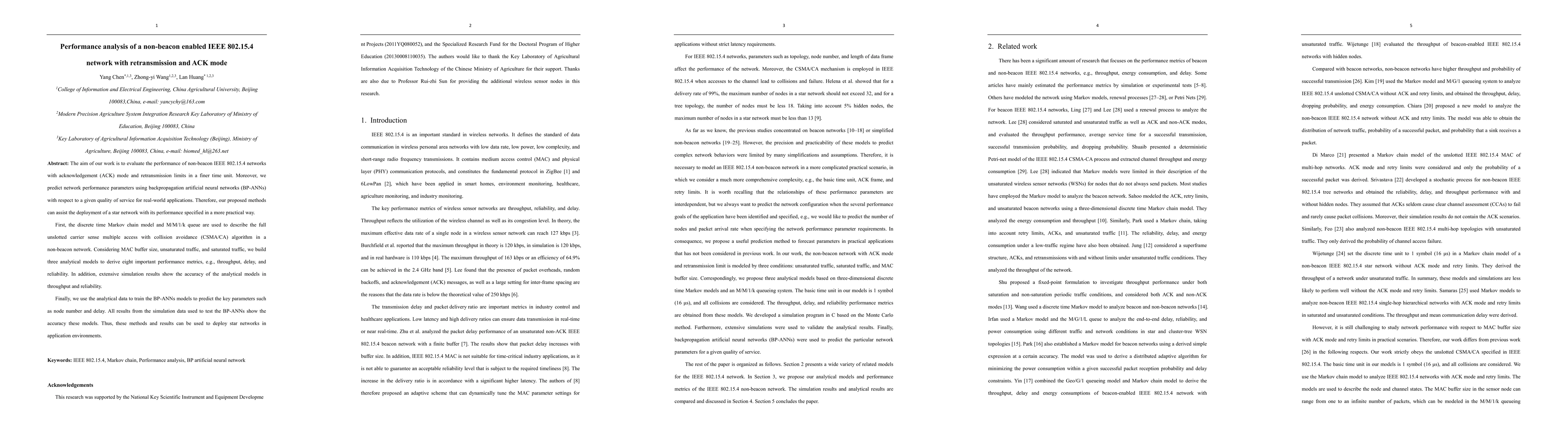 This paper evaluates the performance of non-beacon IEEE 802.15.4 networks with ACK mode and retransmission limits, using analytical models and BP-ANNs to predict throughput, delay, and reliability. The study employs Markov chains and queueing models to derive performance metrics and validates these models with simulations.