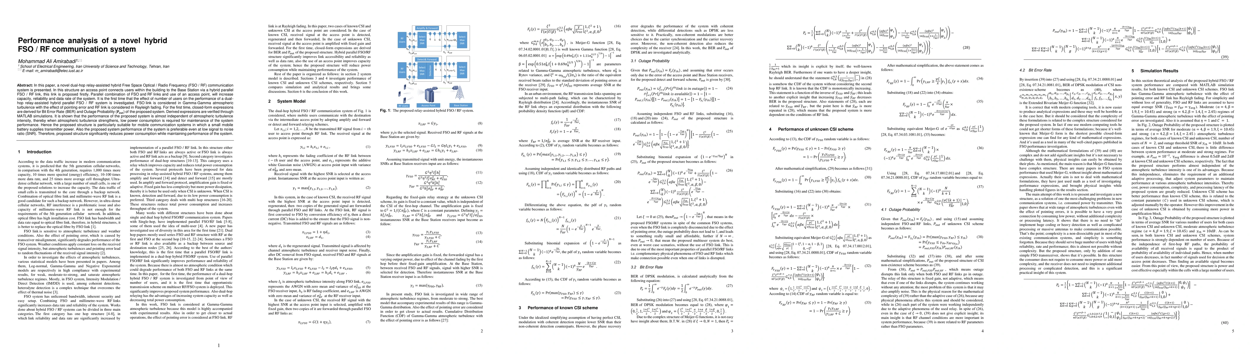 This paper introduces a novel dual-hop relay-assisted hybrid FSO/RF communication system, analyzing its performance with closed-form expressions for BER and outage probability. The system maintains performance with low power consumption, making it suitable for mobile communication systems.