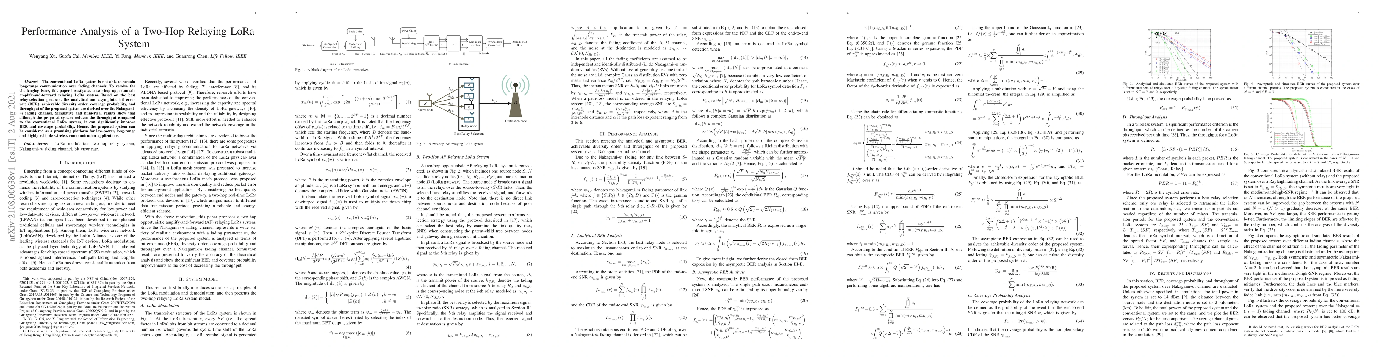 A two-hop relaying LoRa system improves bit error rate and coverage probability while reducing throughput compared to conventional LoRa systems.