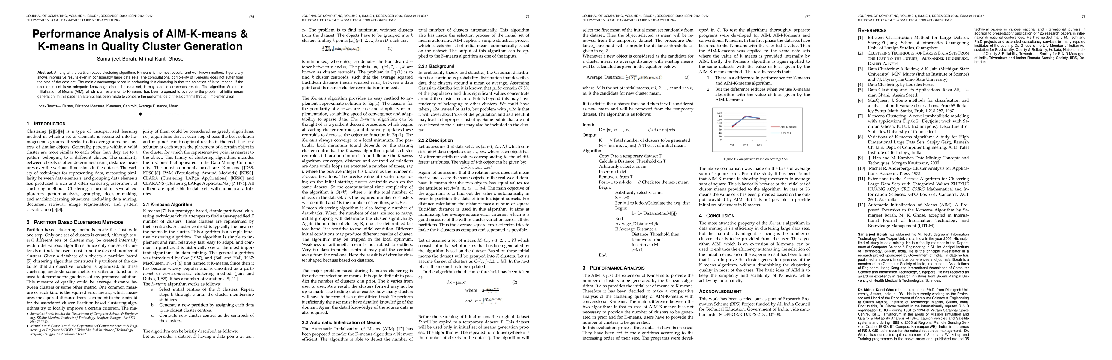 This paper compares the performance of AIM-K-means and K-means clustering algorithms in generating quality clusters. It aims to overcome the initial mean generation issue in K-means through Automatic Initialization of Means (AIM) algorithm.