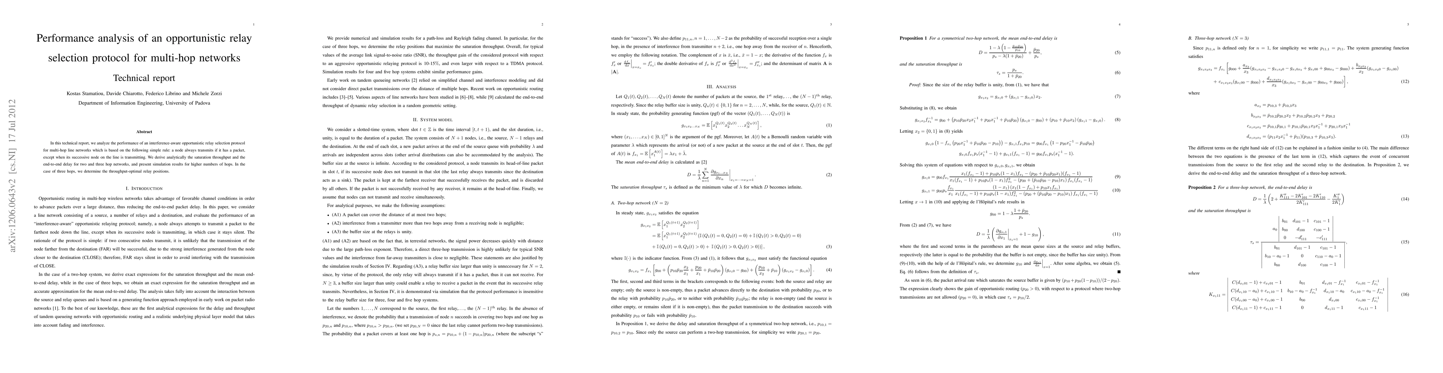 This technical report evaluates an interference-aware opportunistic relay selection protocol for multi-hop networks, deriving analytical results for saturation throughput and end-to-end delay in two and three hop networks, and presenting simulation results for more hops. Optimal relay positions for three-hop networks are also determined.