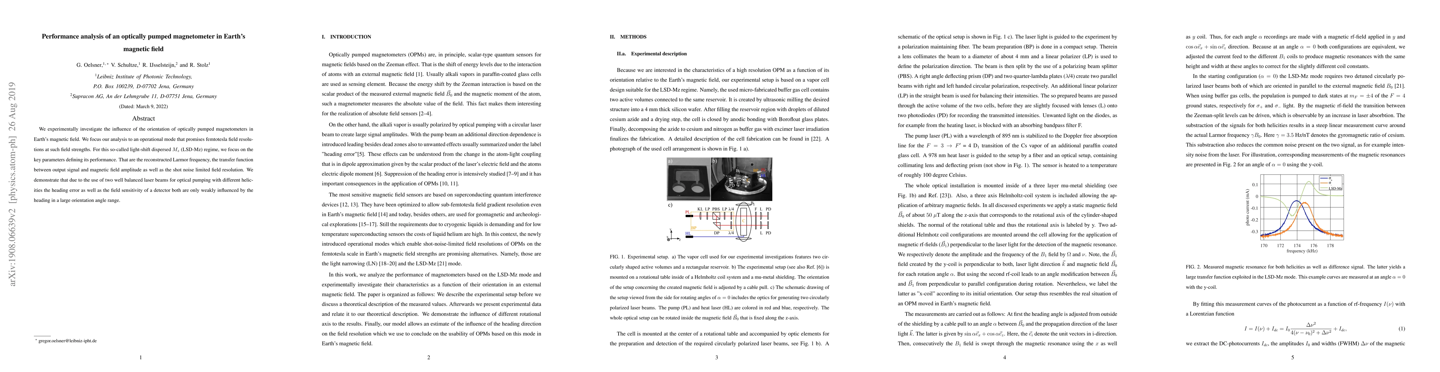 We experimentally investigate the influence of the orientation of optically pumped magnetometers in Earth's magnetic field. We focus our analysis to an operational mode that promises femtotesla field resolu-tions at such field strengths. For this so-called light-shift dispersed Mz(LSD-Mz) regime, we focus on the key parameters defining its performance. That are the reconstructed Larmor frequency, the transfer function between output signal and magnetic field amplitude as well as the shot noise limited field resolution. We demonstrate that due to the use of two well balanced laser beams for optical pumping with different helicities the heading error as well as the field sensitivity of a detector both are only weakly influenced by the heading in a large orientation angle range.