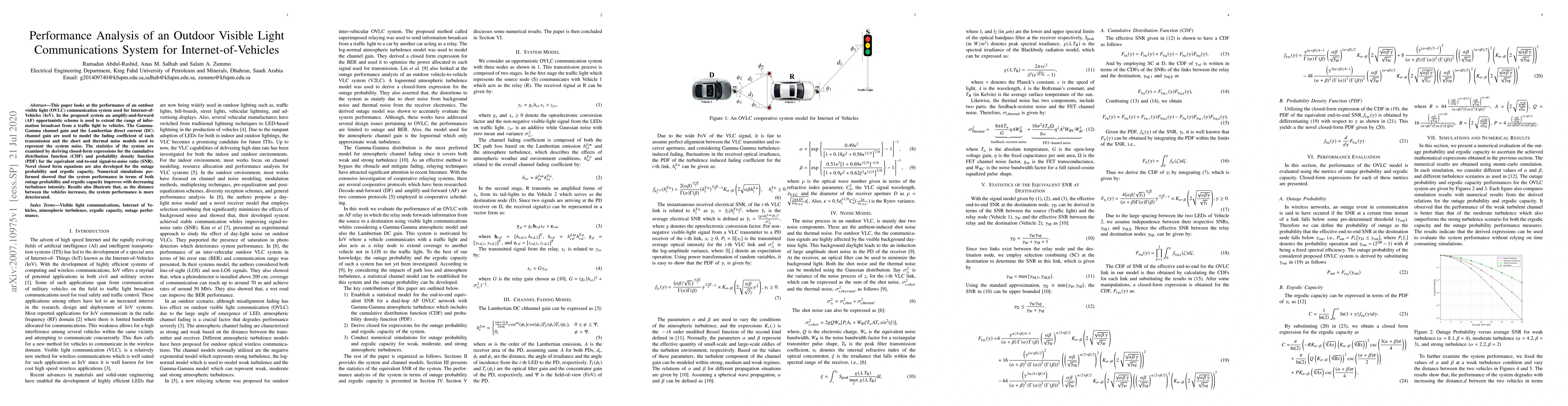 This paper looks at the performance of an outdoor visible light (OVLC) communication system used for Internet-of-Vehicles (IoV). In the proposed system an amplify-and-forward (AF) opportunistic scheme is used to extend the range of information broadcast from a traffic light to vehicles. The Gamma-Gamma channel gain and the Lambertian direct current (DC) channel gain are used to model the fading coefficient of each transmission and the short and thermal noise models used to represent the system noise. The statistics of the system are examined by deriving closed-form expressions for the cumulative distribution function (CDF) and probability density function (PDF) for the equivalent end-to-end signal-to-noise ratio (SNR). Novel closed form equations are also developed for the outage probability and ergodic capacity. Numerical simulations performed showed that the system performance in terms of both outage probability and ergodic capacity improves with decreasing turbulence intensity. Results also illustrate that, as the distance between the vehicles increases, the system performance is more deteriorated.