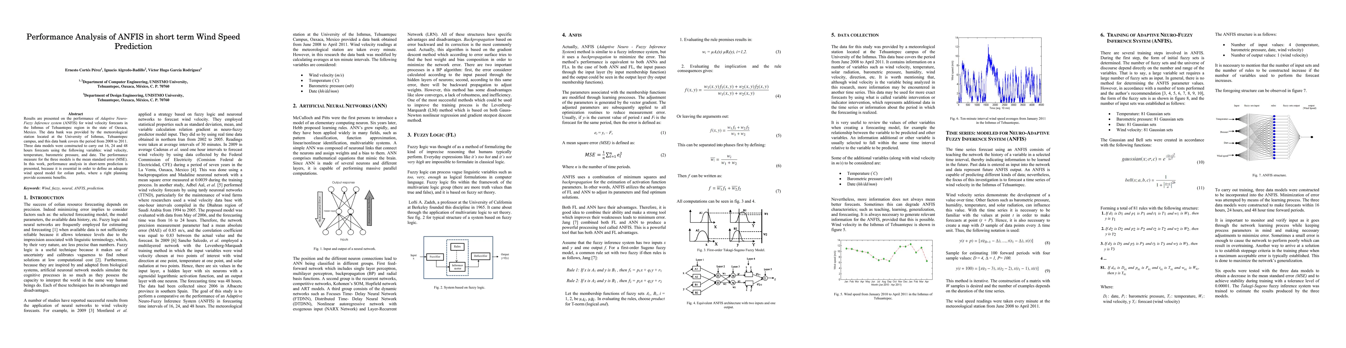 This paper evaluates the performance of the Adaptive Neuro-Fuzzy Inference System (ANFIS) for short-term wind speed forecasts in Oaxaca, Mexico, using data from 2008 to 2011. Models for 16, 24, and 48-hour predictions were developed using wind velocity, temperature, barometric pressure, and date, with mean standard error (MSE) as the performance metric.