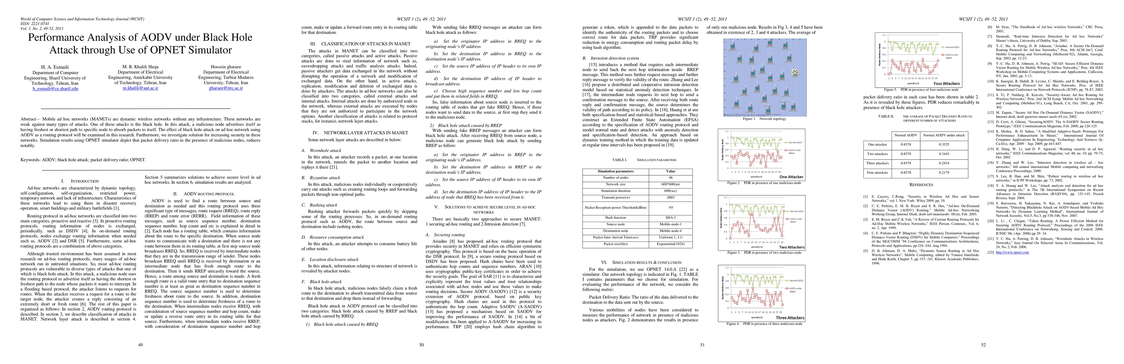 Mobile ad hoc networks (MANETs) are dynamic wireless networks without any infrastructure. These networks are weak against many types of attacks. One of these attacks is the black hole. In this attack, a malicious node advertises itself as having freshest or shortest path to specific node to absorb packets to itself. The effect of black hole attack on ad hoc network using AODV as a routing protocol will be examined in this research. Furthermore, we investigate solution for increasing security in these networks. Simulation results using OPNET simulator depict that packet delivery ratio in the presence of malicious nodes, reduces notably.