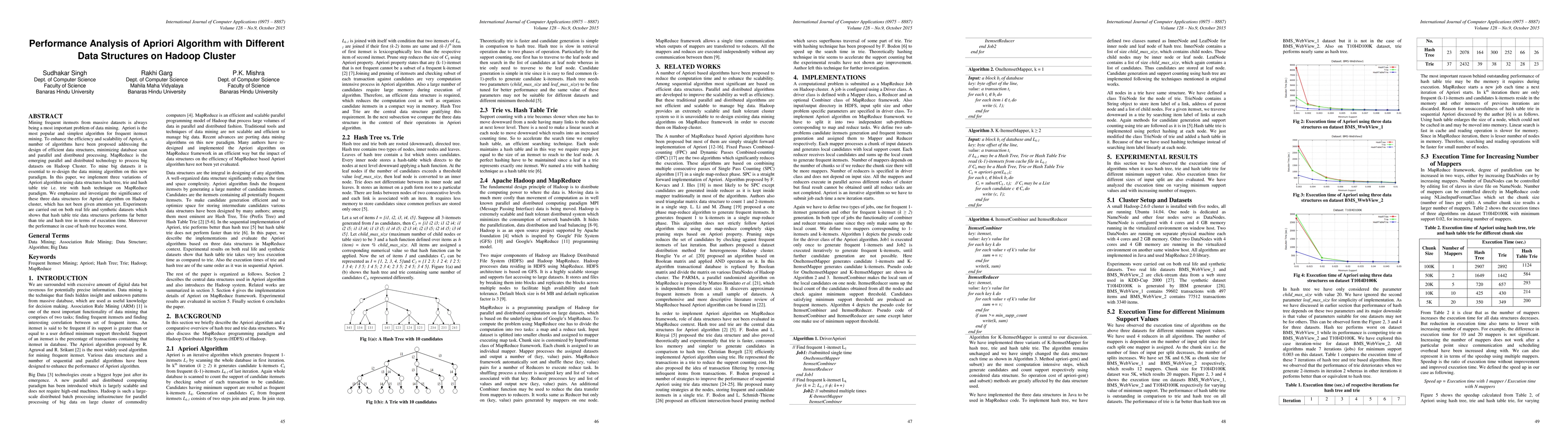 This paper investigates the performance of three variations of the Apriori algorithm—using hash tree, trie, and hash table trie data structures—on a Hadoop cluster under MapReduce. Experimental results show that the hash table trie structure outperforms trie and hash tree in execution time, highlighting its efficiency in big data mining.