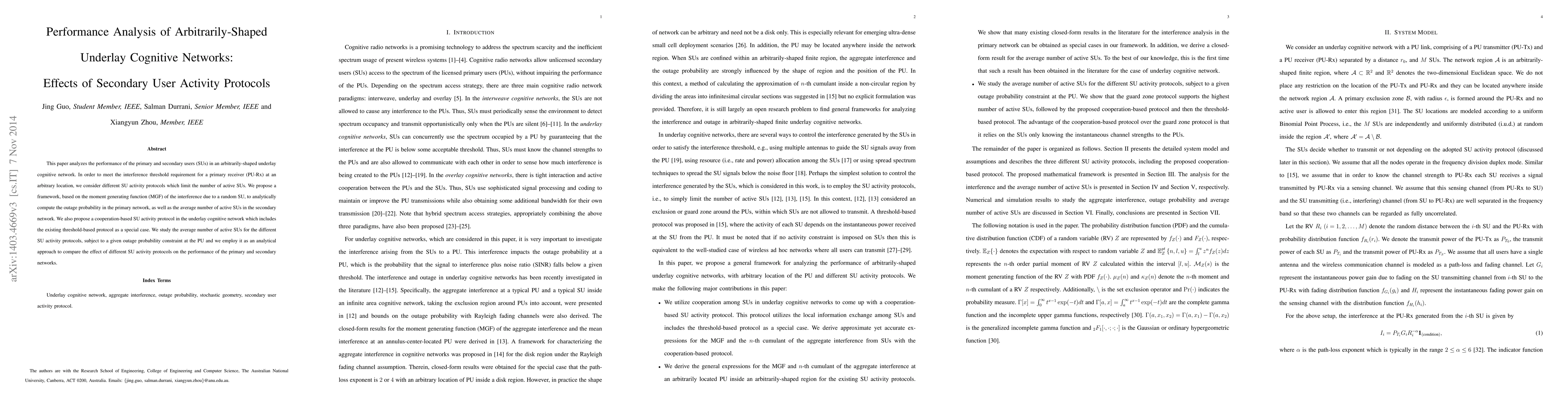 This paper evaluates the performance of primary and secondary users in arbitrarily-shaped underlay cognitive networks, focusing on various secondary user activity protocols that control the number of active users. It proposes an analytical framework using the moment generating function to compute outage probability and the average number of active secondary users, comparing the effects of different protocols on network performance.