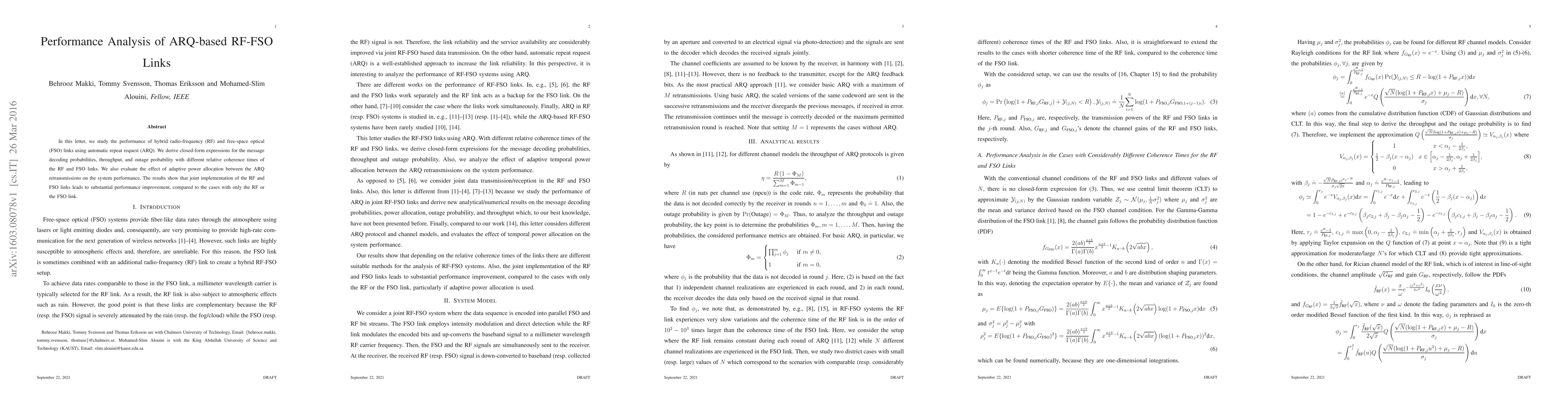 This paper evaluates the performance of hybrid RF-FSO communication links using ARQ, deriving expressions for decoding probabilities, throughput, and outage probability. Adaptive power allocation enhances system performance, showing that combining RF and FSO links significantly improves results over using either alone.
