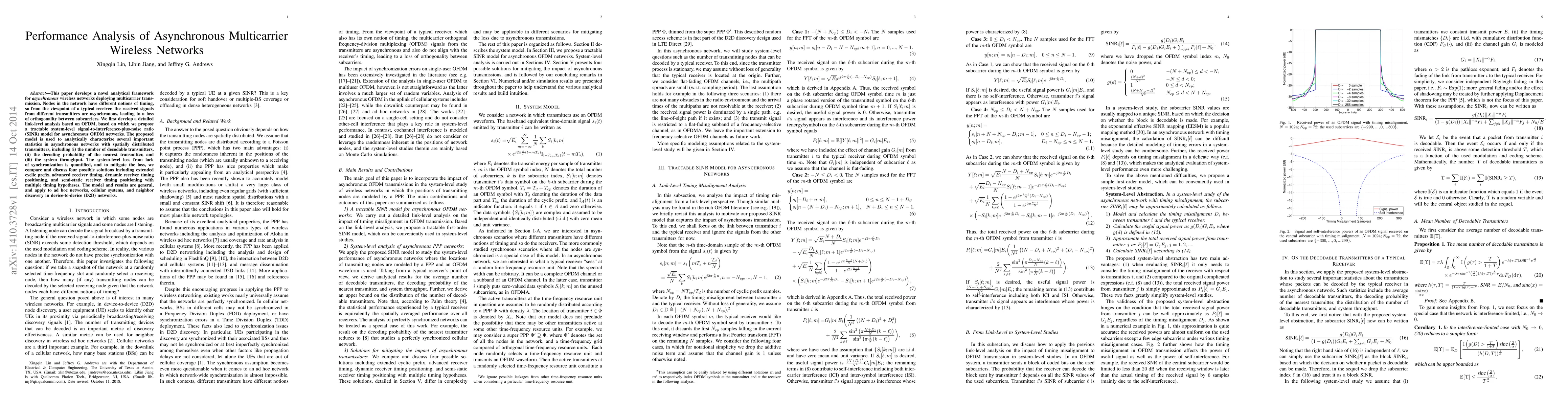This paper develops a novel analytical framework for asynchronous wireless networks deploying multicarrier transmission. Nodes in the network have different notions of timing, so from the viewpoint of a typical receiver, the received signals from different transmitters are asynchronous, leading to a loss of orthogonality between subcarriers. We first develop a detailed link-level analysis based on OFDM, based on which we propose a tractable system-level signal-to-interference-plus-noise ratio (SINR) model for asynchronous OFDM networks. The proposed model is used to analytically characterize several important statistics in asynchronous networks with spatially distributed transmitters, including (i) the number of decodable transmitters, (ii) the decoding probability of the nearest transmitter, and (iii) the system throughput. The system-level loss from lack of synchronization is quantified, and to mitigate the loss, we compare and discuss four possible solutions including extended cyclic prefix, advanced receiver timing, dynamic receiver timing positioning, and semi-static receiver timing positioning with multiple timing hypotheses. The model and results are general, and apply to ad hoc networks, cellular systems, and neighbor discovery in device-to-device (D2D) networks.