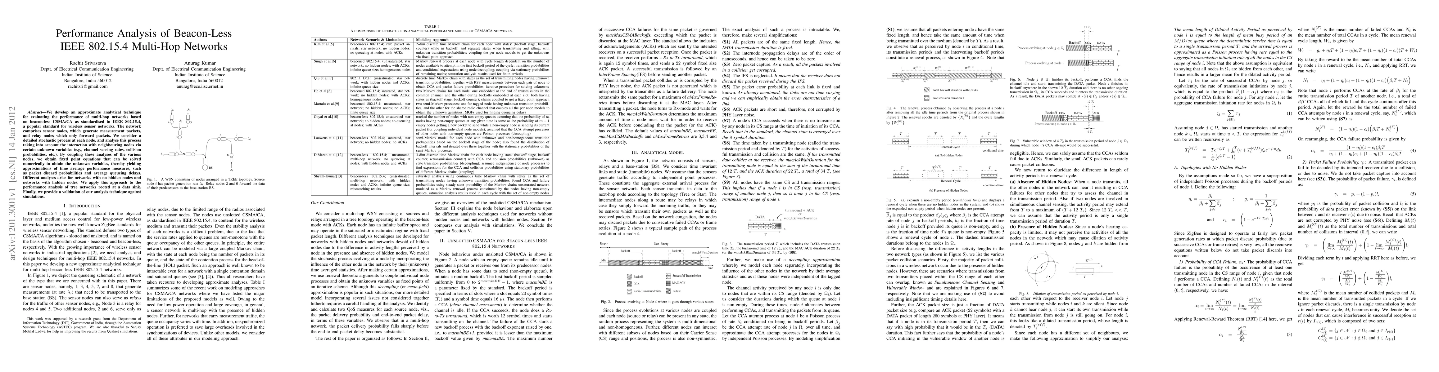 This paper develops an analytical technique to evaluate the performance of beacon-less IEEE 802.15.4 multi-hop networks, focusing on packet discard probabilities and queueing delays. The technique considers stochastic processes and interactions among nodes, providing numerical approximations validated against simulations.