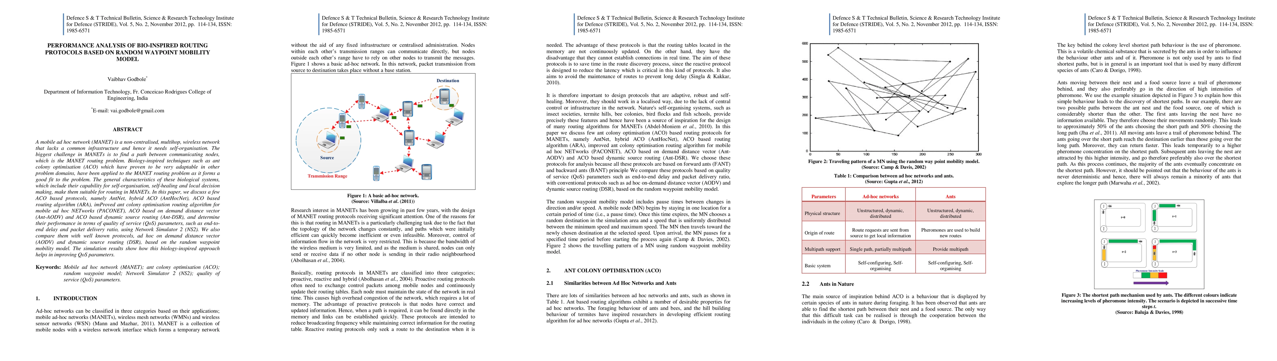 This paper evaluates the performance of various bio-inspired routing protocols, such as AntNet and Ant-AODV, in mobile ad hoc networks (MANETs) using the random waypoint mobility model. The study compares these protocols against traditional methods like AODV and DSR, showing that bio-inspired techniques enhance QoS parameters like delay and packet delivery ratio.