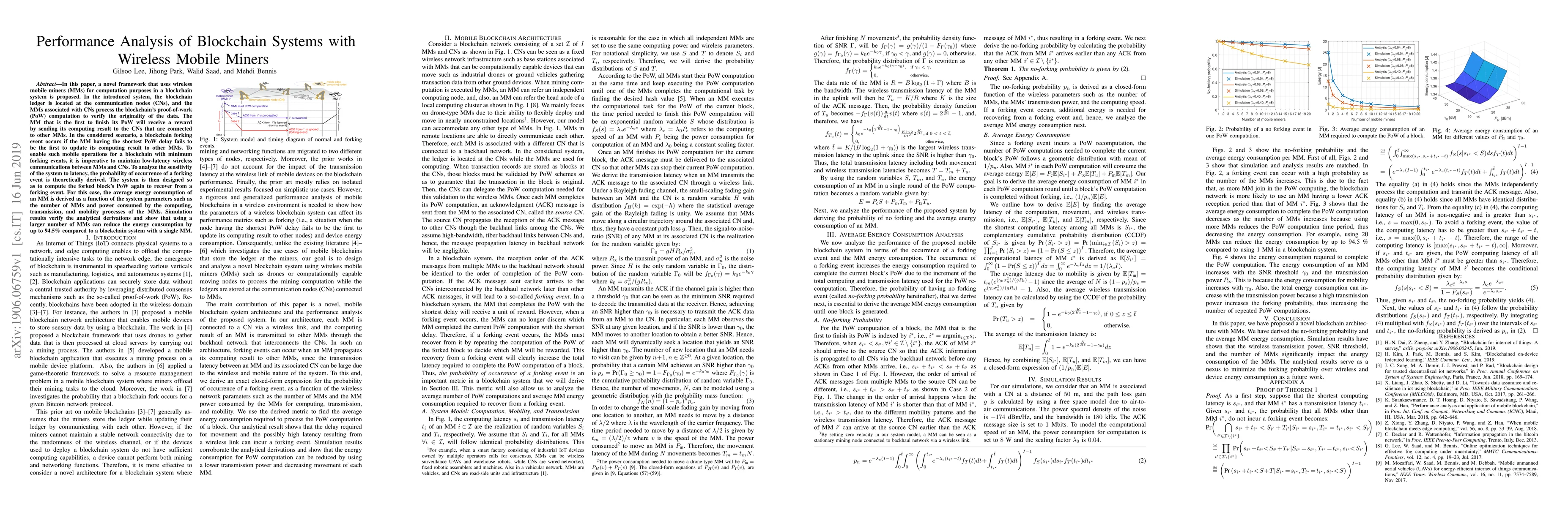 This paper proposes a framework using wireless mobile miners to perform blockchain proof-of-work computations, with the blockchain ledger located at communication nodes. It analyzes the system's sensitivity to latency and derives the probability of blockchain forking events, showing that a larger number of mobile miners can reduce energy consumption by up to 94.5%.