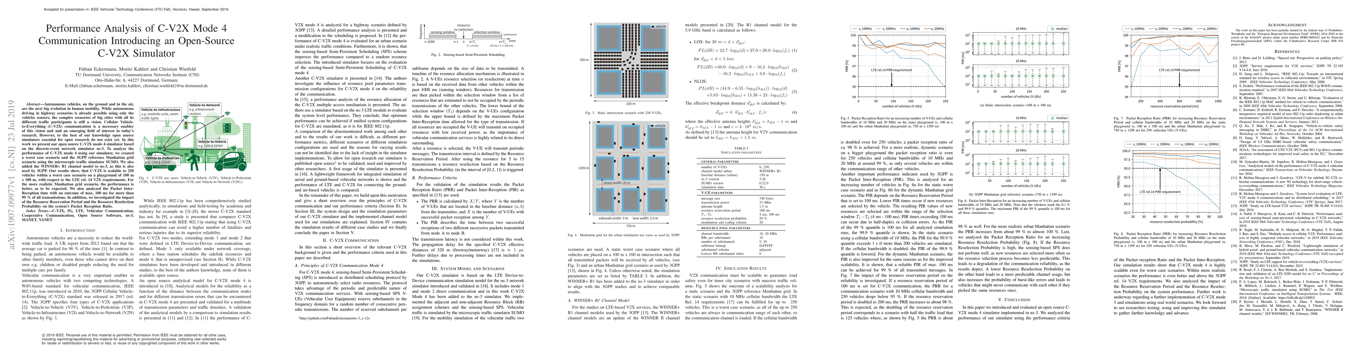 This paper introduces an open-source C-V2X mode 4 simulator based on ns-3 to analyze performance in complex urban scenarios. Results show C-V2X is scalable and meets LTE V2X requirements, with a Packet Inter-Reception time of max. 100 ms for over 99% of transmissions.