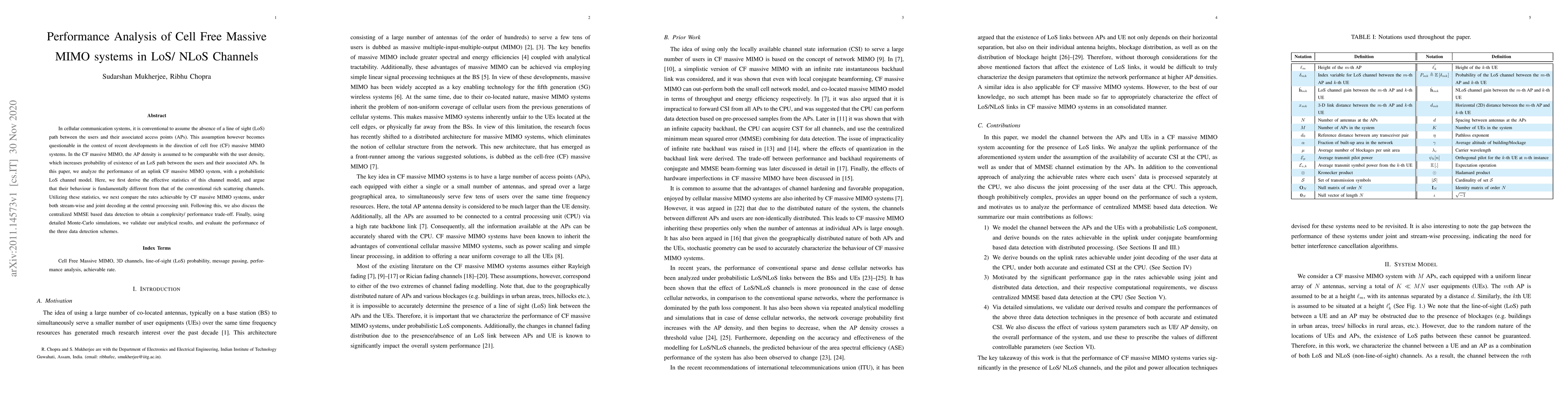This paper analyzes the performance of uplink cell-free massive MIMO systems under line of sight (LoS) and non-line of sight (NLoS) channels, deriving effective channel statistics and comparing achievable rates under different decoding schemes. Monte-Carlo simulations validate analytical results and evaluate performance trade-offs.