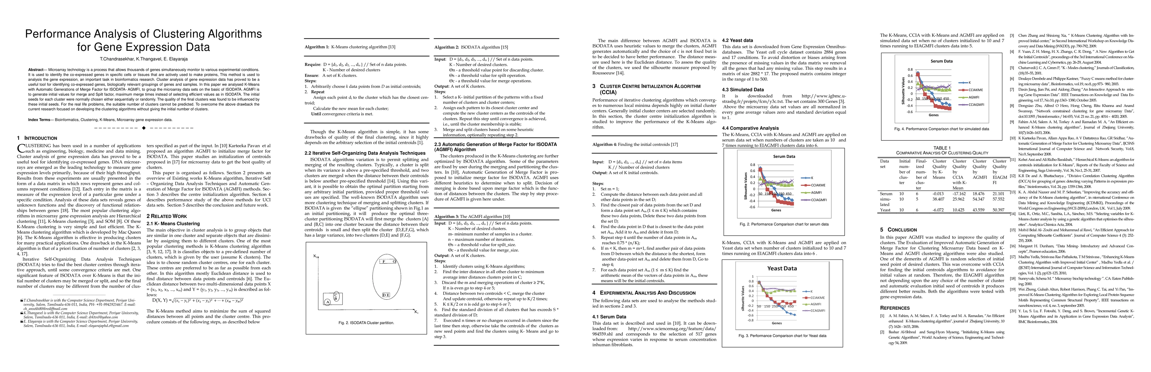 Microarray technology is a process that allows thousands of genes simultaneously monitor to various experimental conditions. It is used to identify the co-expressed genes in specific cells or tissues that are actively used to make proteins, This method is used to analysis the gene expression, an important task in bioinformatics research. Cluster analysis of gene expression data has proved to be a useful tool for identifying co-expressed genes, biologically relevant groupings of genes and samples. In this paper we analysed K-Means with Automatic Generations of Merge Factor for ISODATA- AGMFI, to group the microarray data sets on the basic of ISODATA. AGMFI is to generate initial values for merge and Spilt factor, maximum merge times instead of selecting efficient values as in ISODATA. The initial seeds for each cluster were normally chosen either sequentially or randomly. The quality of the final clusters was found to be influenced by these initial seeds. For the real life problems, the suitable number of clusters cannot be predicted. To overcome the above drawback the current research focused on developing the clustering algorithms without giving the initial number of clusters.