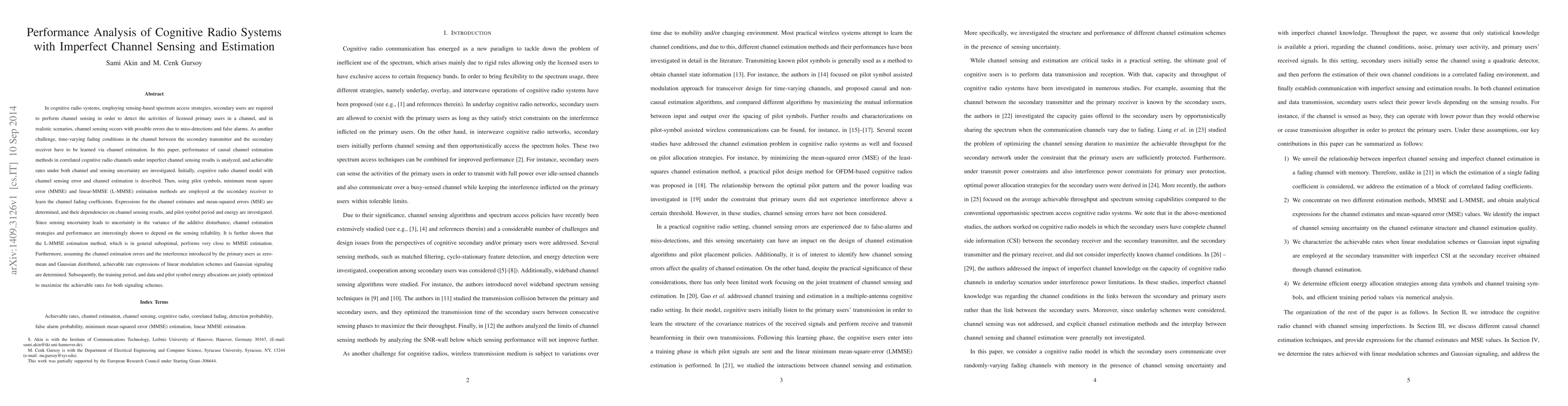 This paper analyzes the performance of cognitive radio systems under imperfect channel sensing and estimation, focusing on the impact of sensing errors and time-varying fading. It employs MMSE and L-MMSE channel estimation methods, optimizes training and pilot symbol allocations, and determines achievable rates for linear modulation and Gaussian signaling.
