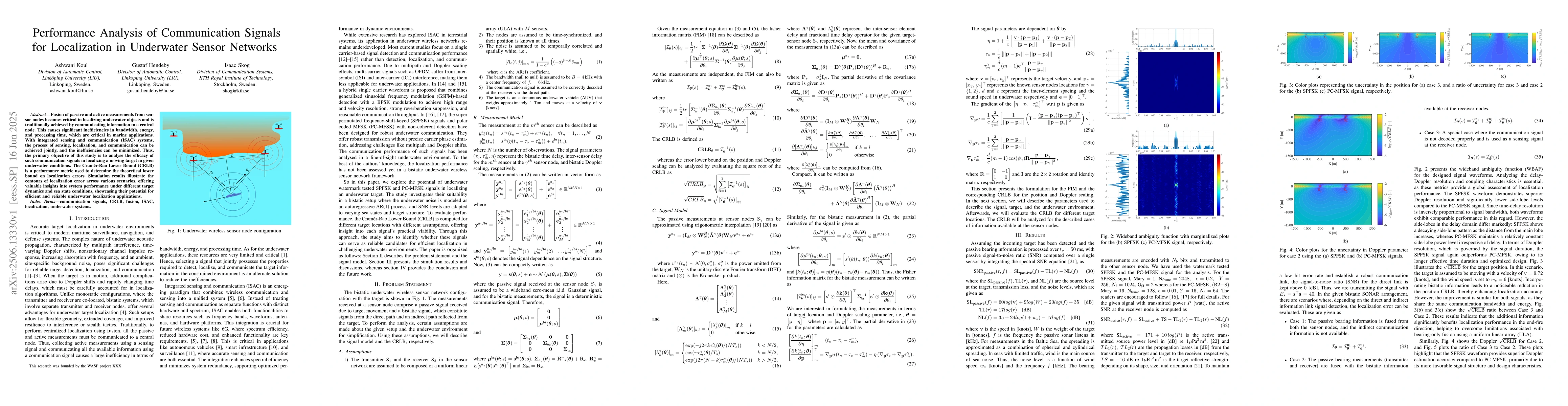 Fusion of passive and active measurements from sensor nodes becomes critical in localizing underwater objects and is traditionally achieved by communicating information to a central node. This causes significant inefficiencies in bandwidth, energy, and processing time, which are critical in marine applications. With integrated sensing and communication (ISAC) systems, the process of sensing, localization, and communication can be achieved jointly, and the inefficiencies can be minimized. Thus, the primary objective of this study is to analyse the efficacy of such communication signals in localizing a moving target in given underwater conditions. The Cram\'er-Rao Lower Bound (CRLB) is a performance metric used to determine the theoretical lower bound on localization errors. Simulation results illustrate the contours of localization error across various scenarios, offering valuable insights into system performance under different target dynamics and sea state conditions, showcasing their potential for efficient and reliable underwater localization applications.