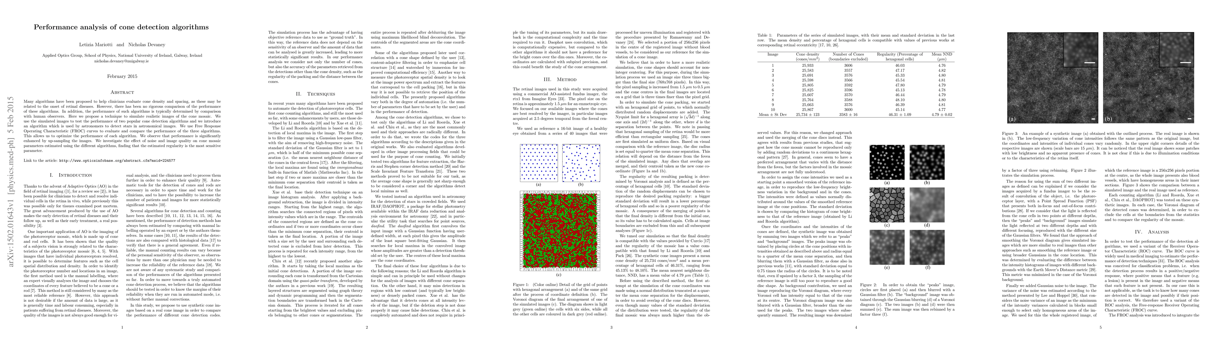 Researchers compared the performance of three cone detection algorithms using simulated images, finding that up-sampling significantly enhances performance, with estimated regularity being the most sensitive parameter to image quality and noise.