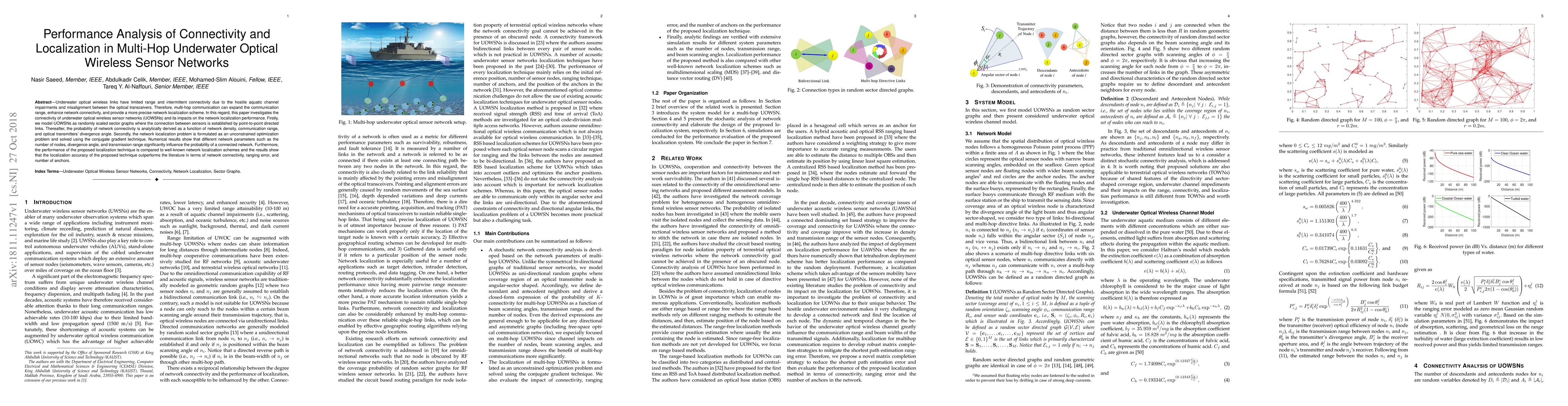 This paper analyzes the connectivity and localization in multi-hop underwater optical wireless sensor networks, modeling them as randomly scaled sector graphs. The study derives the probability of network connectivity as a function of network density, range, and divergence angle, and proposes an optimization-based localization technique that outperforms existing methods in terms of accuracy and connectivity.