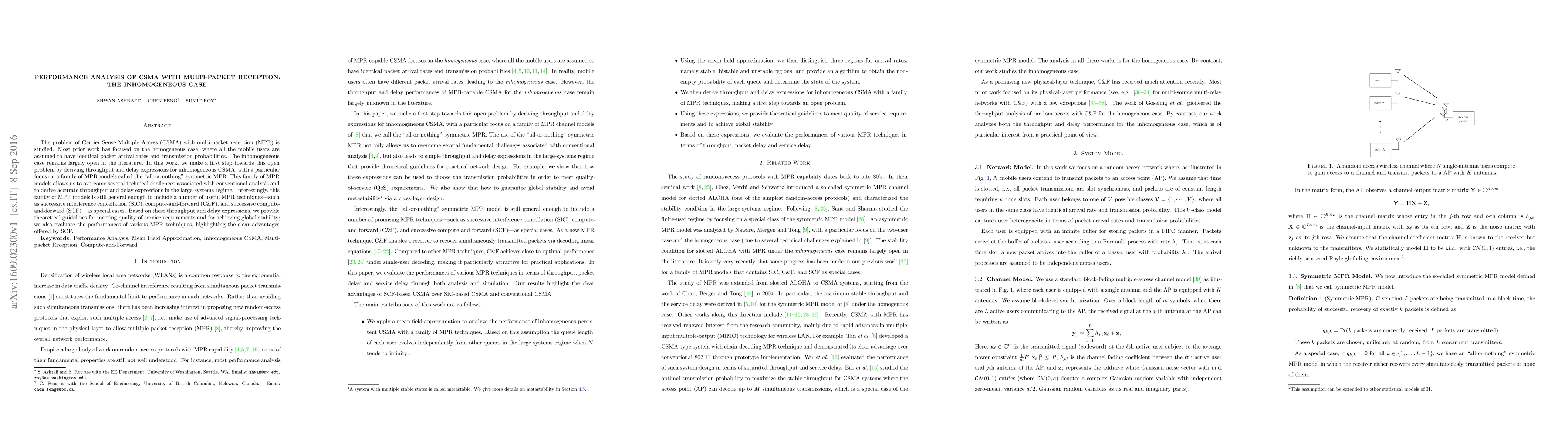 The problem of Carrier Sense Multiple Access (CSMA) with multi-packet reception (MPR) is studied. Most prior work has focused on the homogeneous case, where all the mobile users are assumed to have identical packet arrival rates and transmission probabilities. The inhomogeneous case remains largely open in the literature. In this work, we make a first step towards this open problem by deriving throughput and delay expressions for inhomogeneous CSMA, with a particular focus on a family of MPR models called the "all-or-nothing" symmetric MPR. This family of MPR models allows us to overcome several technical challenges associated with conventional analysis and to derive accurate throughput and delay expressions in the large-systems regime. Interestingly, this family of MPR models is still general enough to include a number of useful MPR techniques - such as successive interference cancellation (SIC), compute-and-forward (C&F), and successive compute-and-forward (SCF) - as special cases. Based on these throughput and delay expressions, we provide theoretical guidelines for meeting quality-of-service requirements and for achieving global stability; we also evaluate the performances of various MPR techniques, highlighting the clear advantages offered by SCF.