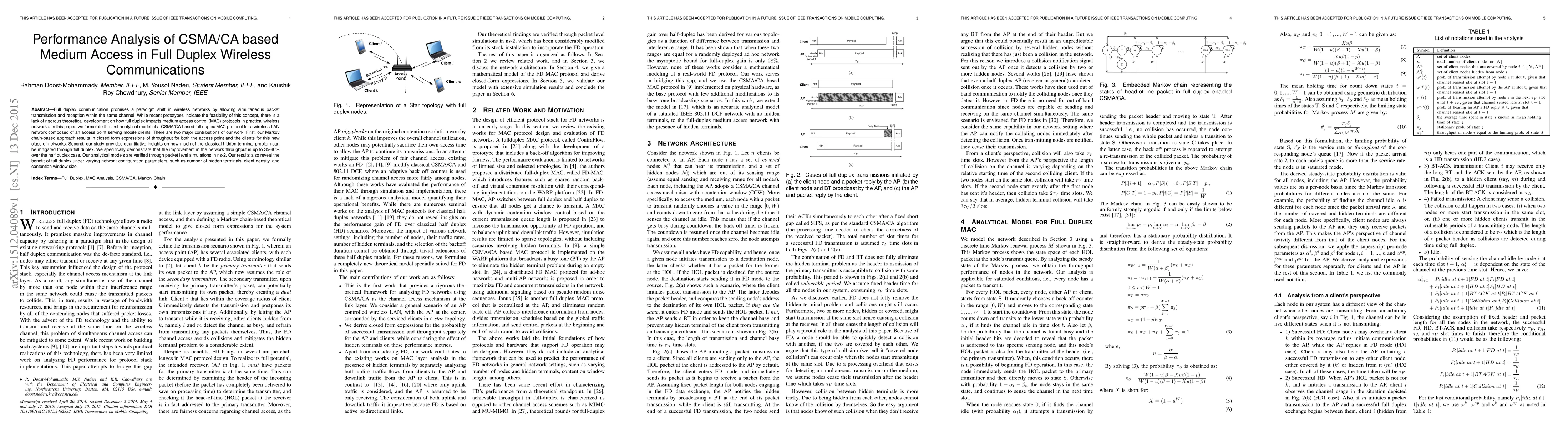 This paper develops an analytical model for a CSMA/CA based full duplex MAC protocol in wireless LANs, deriving closed-form expressions for throughput and demonstrating a 35-40% improvement over half duplex, while also mitigating the hidden terminal problem. Simulation results validate the model and show benefits under various network configurations.