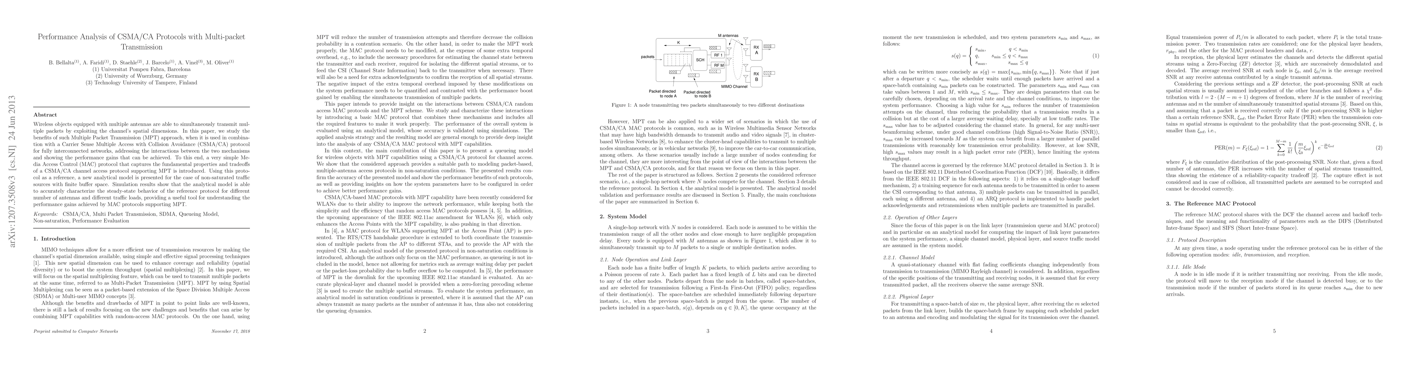 Wireless objects equipped with multiple antennas are able to simultaneously transmit multiple packets by exploiting the channel's spatial dimensions. In this paper, we study the benefits of such Multiple Packet Transmission (MPT) approach, when it is used in combination with a Carrier Sense Multiple Access with Collision Avoidance (CSMA/CA) protocol for fully interconnected networks, addressing the interactions between the two mechanisms and showing the performance gains that can be achieved. To this end, a very simple Media Access Control (MAC) protocol that captures the fundamental properties and tradeoffs of a CSMA/CA channel access protocol supporting MPT is introduced. Using this protocol as a reference, a new analytical model is presented for the case of non-saturated traffic sources with finite buffer space. Simulation results show that the analytical model is able to accurately characterize the steady-state behaviour of the reference protocol for different number of antennas and different traffic loads, providing a useful tool for understanding the performance gains achieved by MAC protocols supporting MPT.