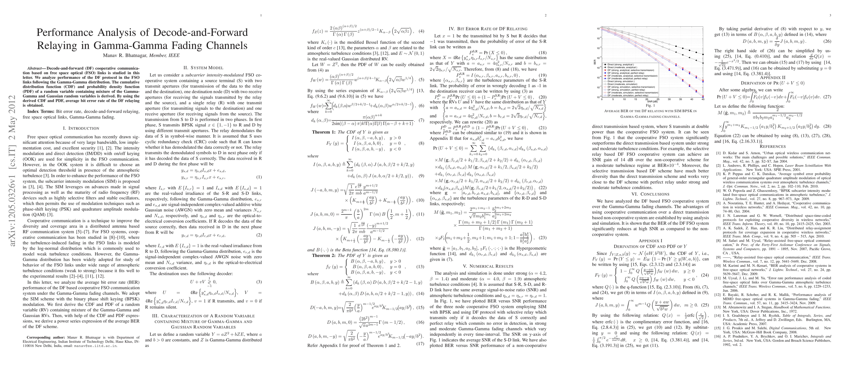 This paper analyzes the performance of decode-and-forward relaying in free space optical links under Gamma-Gamma fading conditions. The study derives the cumulative distribution function and probability density function of a mixed Gamma-Gamma and Gaussian random variable to determine the average bit error rate of the DF relaying protocol.