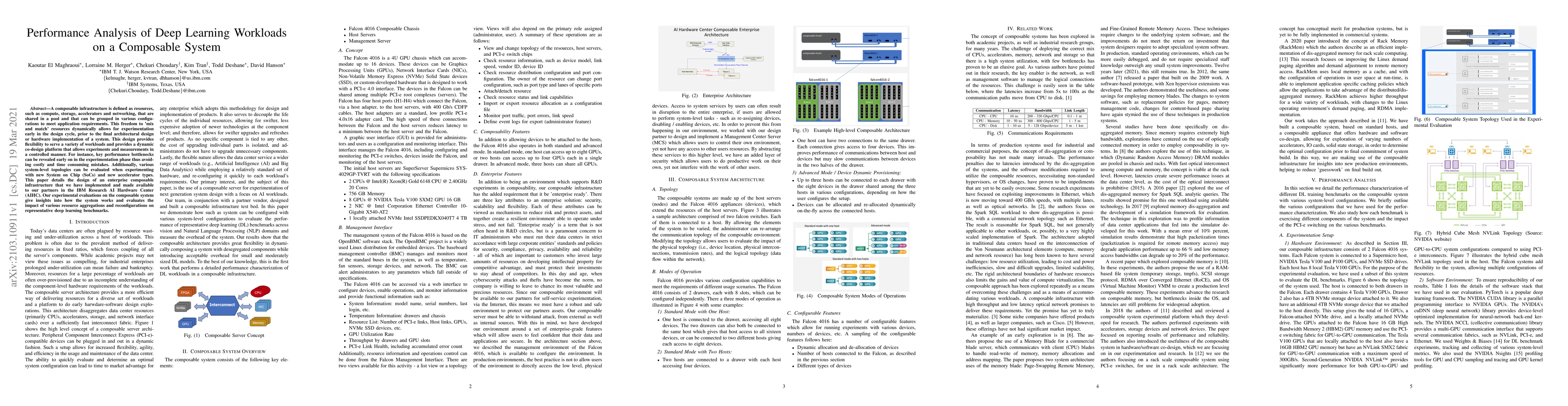 This paper presents an enterprise composable infrastructure designed to dynamically allocate resources for deep learning workloads, enabling early experimentation and revealing performance bottlenecks. Experimental evaluations on this system provide insights into the impact of resource configurations on deep learning benchmarks.