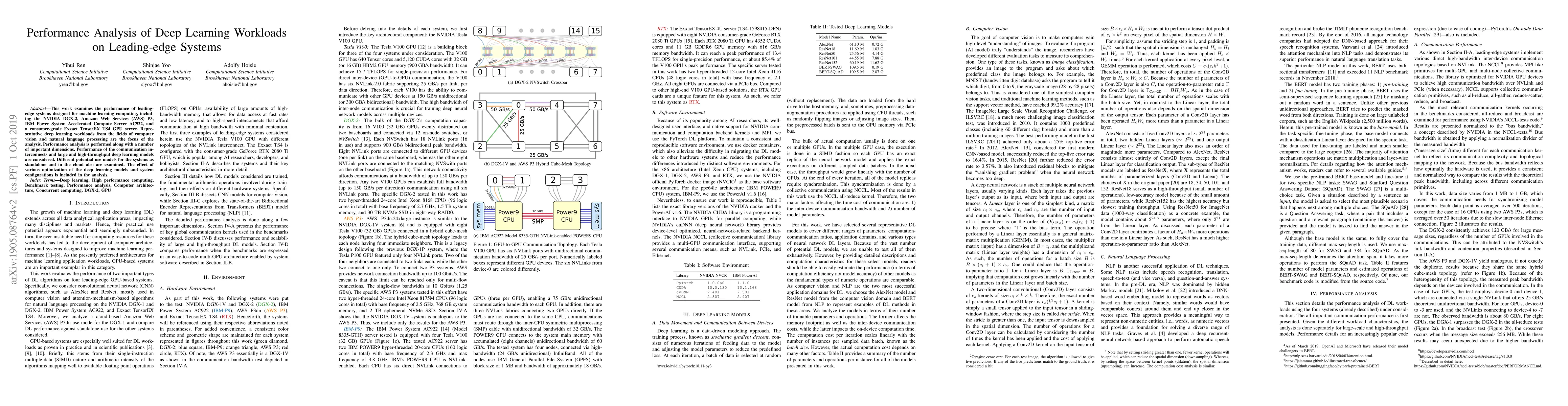 This paper evaluates the performance of advanced machine learning systems, including the NVIDIA DGX-2, AWS P3, IBM AC922, and Exxact TS4, using deep learning workloads in computer vision and natural language processing. It analyzes performance across communication, model optimization, and system use models, both standalone and in cloud environments.