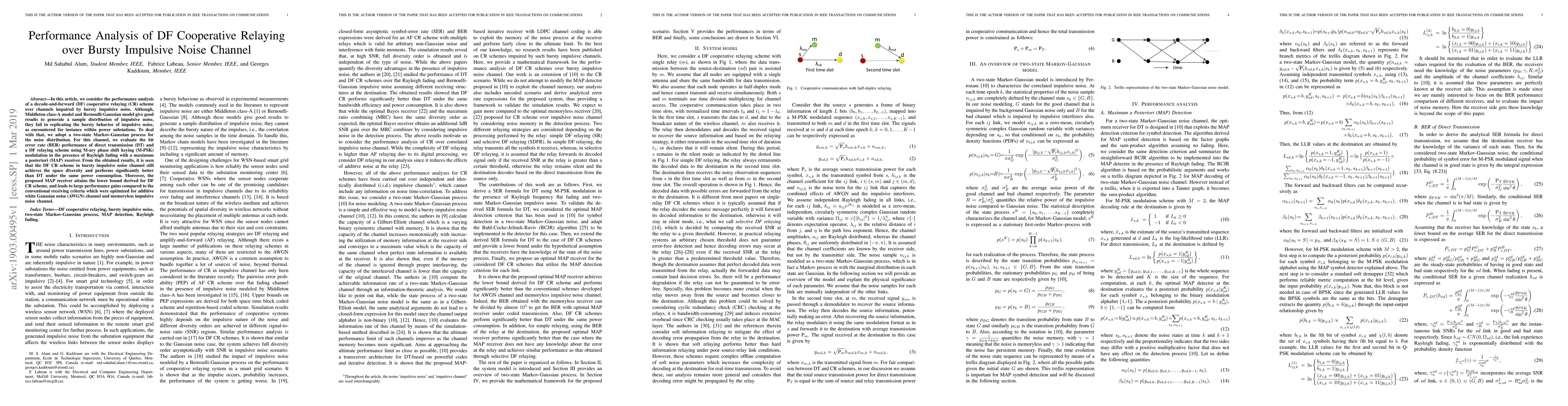 This paper analyzes the performance of a decode-and-forward cooperative relaying scheme over a channel with bursty impulsive noise, using a two-state Markov-Gaussian noise model. It finds that the DF relaying scheme outperforms direct transmission in terms of bit error rate, achieving space diversity and significant gains over conventional methods.