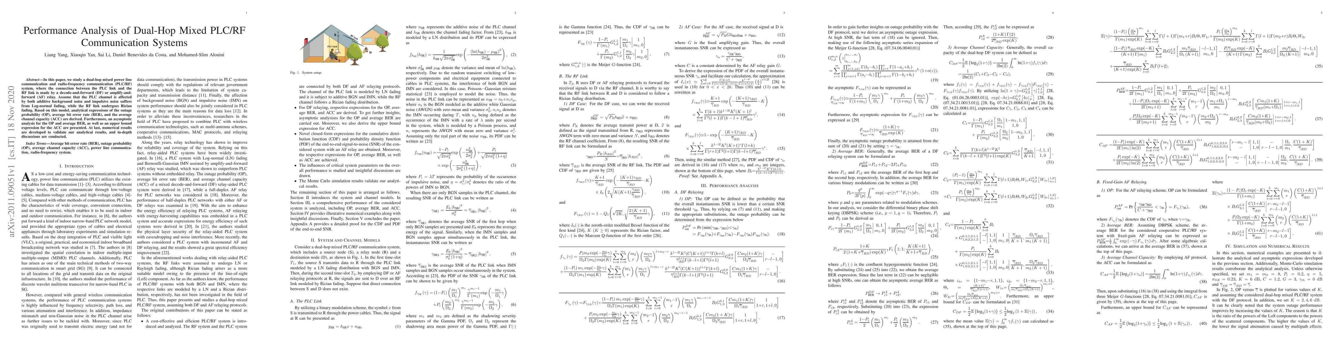 This paper analyzes dual-hop mixed PLC/RF communication systems using DF or AF relays, deriving analytical expressions for outage probability, average BER, and average channel capacity under Log-normal fading for PLC and Rician fading for RF. Numerical results validate the analytical models.
