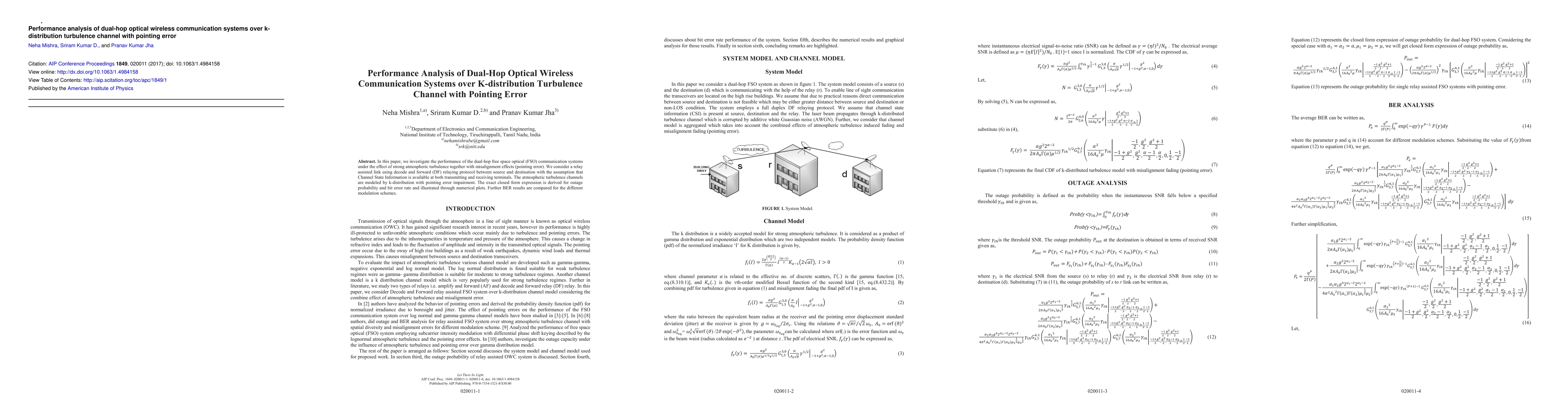 This paper analyzes the performance of dual-hop optical wireless communication systems under k-distribution turbulence and pointing error, deriving exact closed-form expressions for outage probability and bit error rate. It evaluates the impact of various modulation schemes on system performance in relay-assisted decode and forward links.