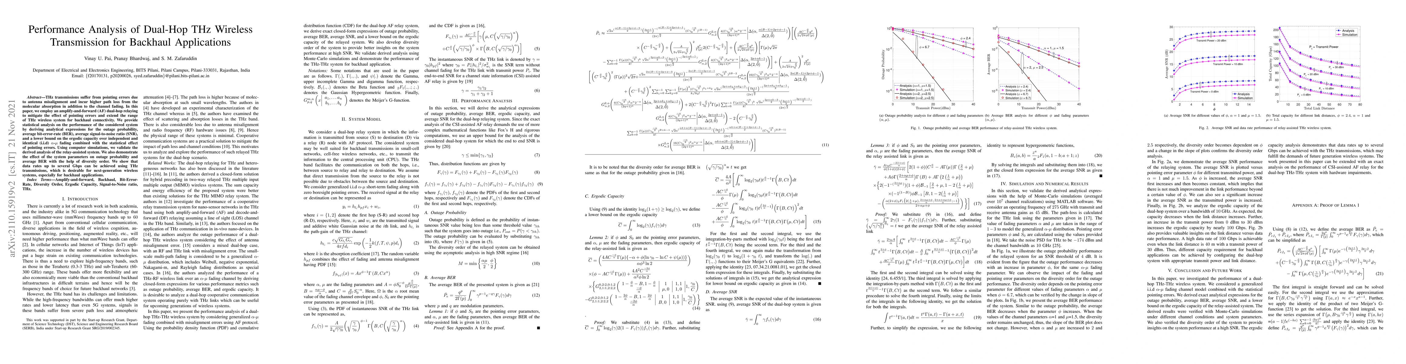 This paper analyzes the performance of dual-hop THz wireless transmission using amplify-and-forward relaying to mitigate pointing errors and extend range. It derives analytical expressions for outage probability, average BER, SNR, and ergodic capacity, validated by simulations, showing that THz can achieve data rates up to several Gbps for next-gen backhaul applications.