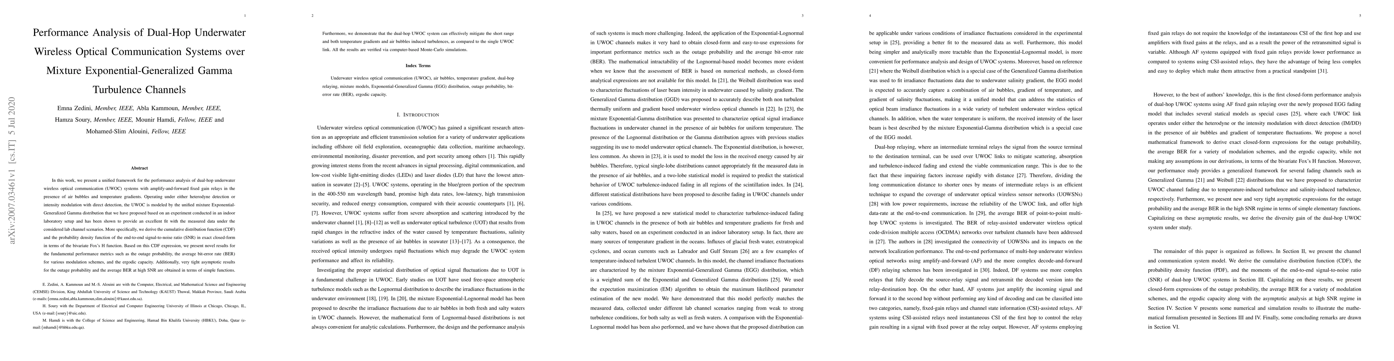 This paper presents a unified framework for analyzing dual-hop underwater wireless optical communication systems under mixture Exponential-Generalized Gamma turbulence, deriving exact closed-form expressions for end-to-end SNR, outage probability, and average BER. The dual-hop system is shown to mitigate turbulence better than single-hop links.