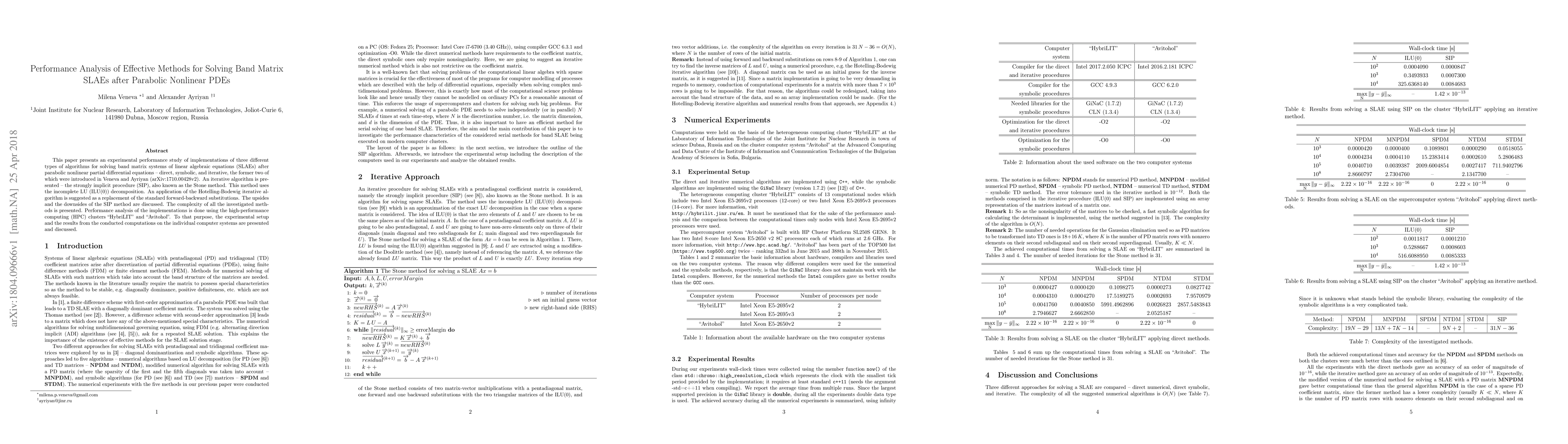 This paper evaluates the performance of three algorithms for solving band matrix SLAEs derived from parabolic nonlinear PDEs: direct, symbolic, and iterative (SIP). The study compares these methods using HPC clusters and discusses the strengths and weaknesses of the SIP method, which employs ILU(0) decomposition.