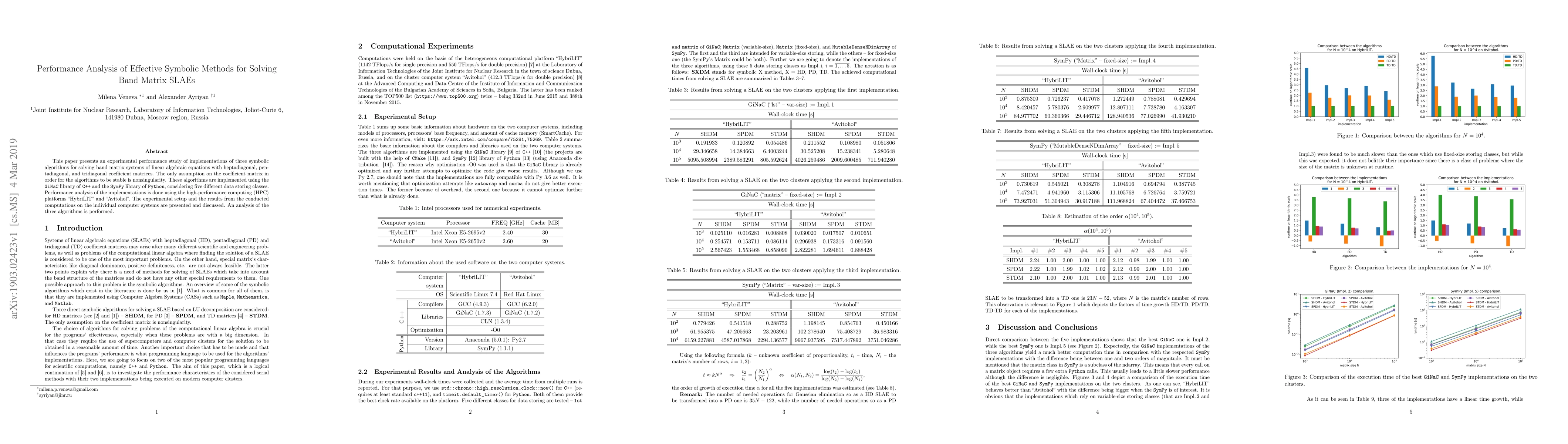 This paper evaluates the performance of three symbolic algorithms for solving band matrix linear algebraic equations using C++ and Python libraries, analyzing their efficiency on HPC platforms. The study discusses the algorithms' stability under nonsingularity and presents results from computations on different systems.